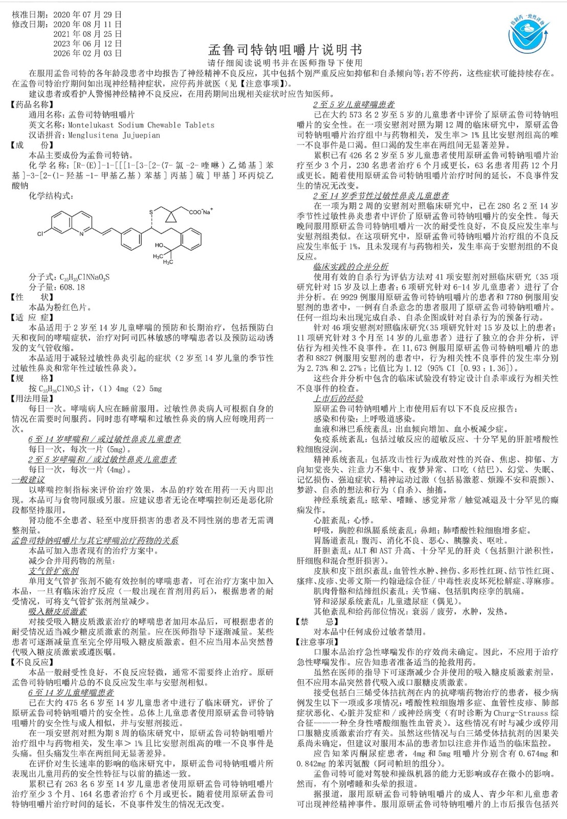 【用法用量】2至5岁哮喘和/或过敏性鼻炎儿童患者每日一次,每次一片(其他服用方法详见说明书)